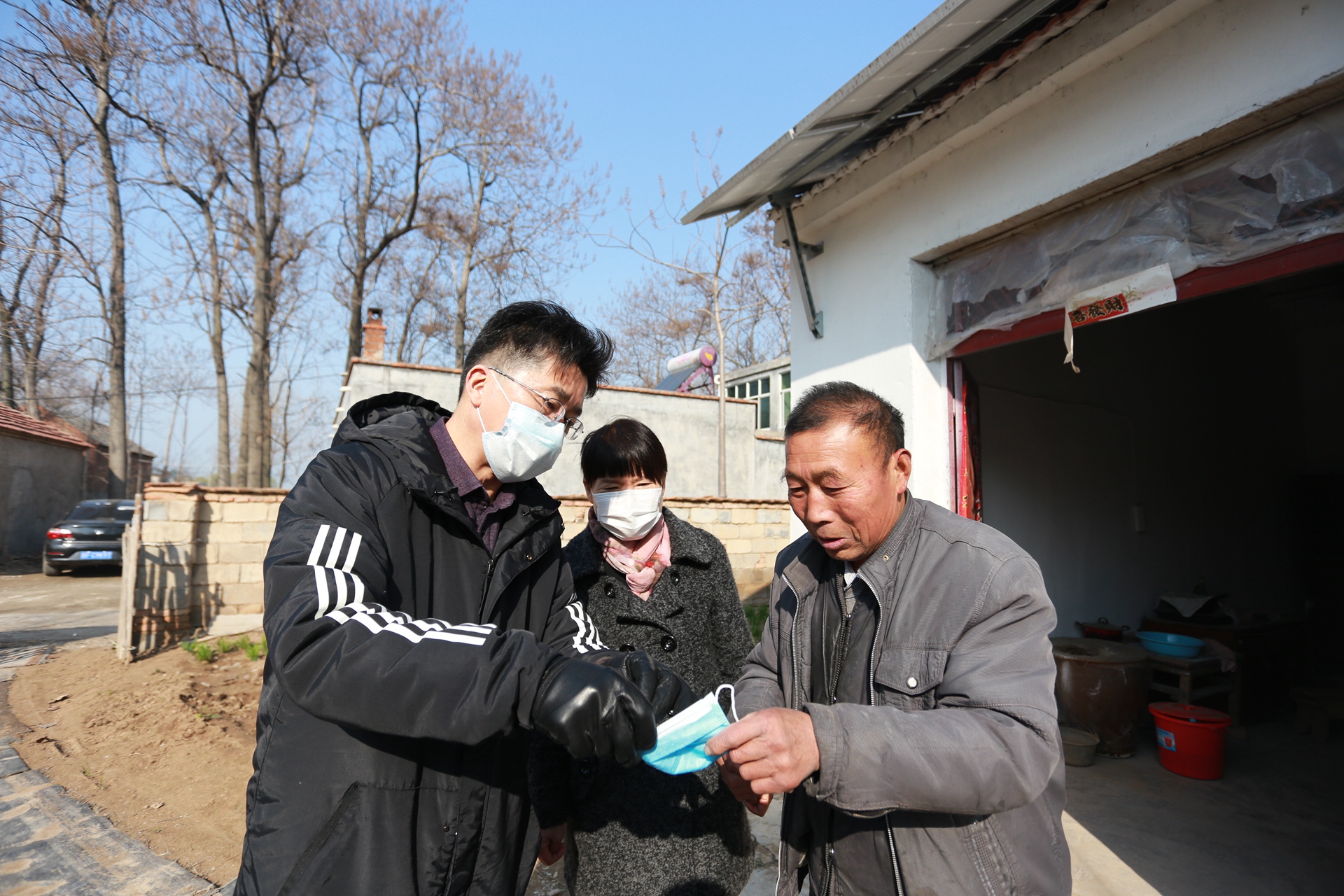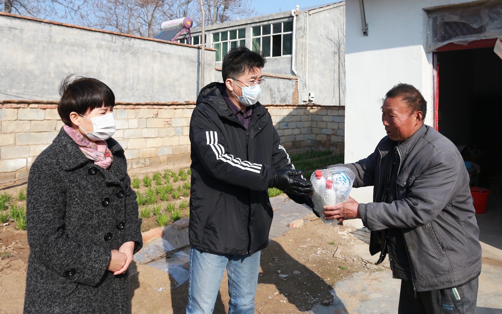 火神廟村黃莊村民黃傳平雙手顫顫巍巍地接過(guò)抗疫防護(hù)物資,開(kāi)心地說(shuō):“我一個(gè)月就戴這一個(gè)口罩,沒(méi)的換,現(xiàn)在好啦,有口罩戴啦。太謝謝你們送來(lái)口罩,酒精和消毒液,還有疫情防控知識(shí),這是今年我收到的最好禮物!” 王獻(xiàn)忠書(shū)記不僅給他們送來(lái)了口罩、酒精等抗疫防護(hù)物資,還耐心地為他們講解口罩的佩戴方法和酒精的正確使用方法。